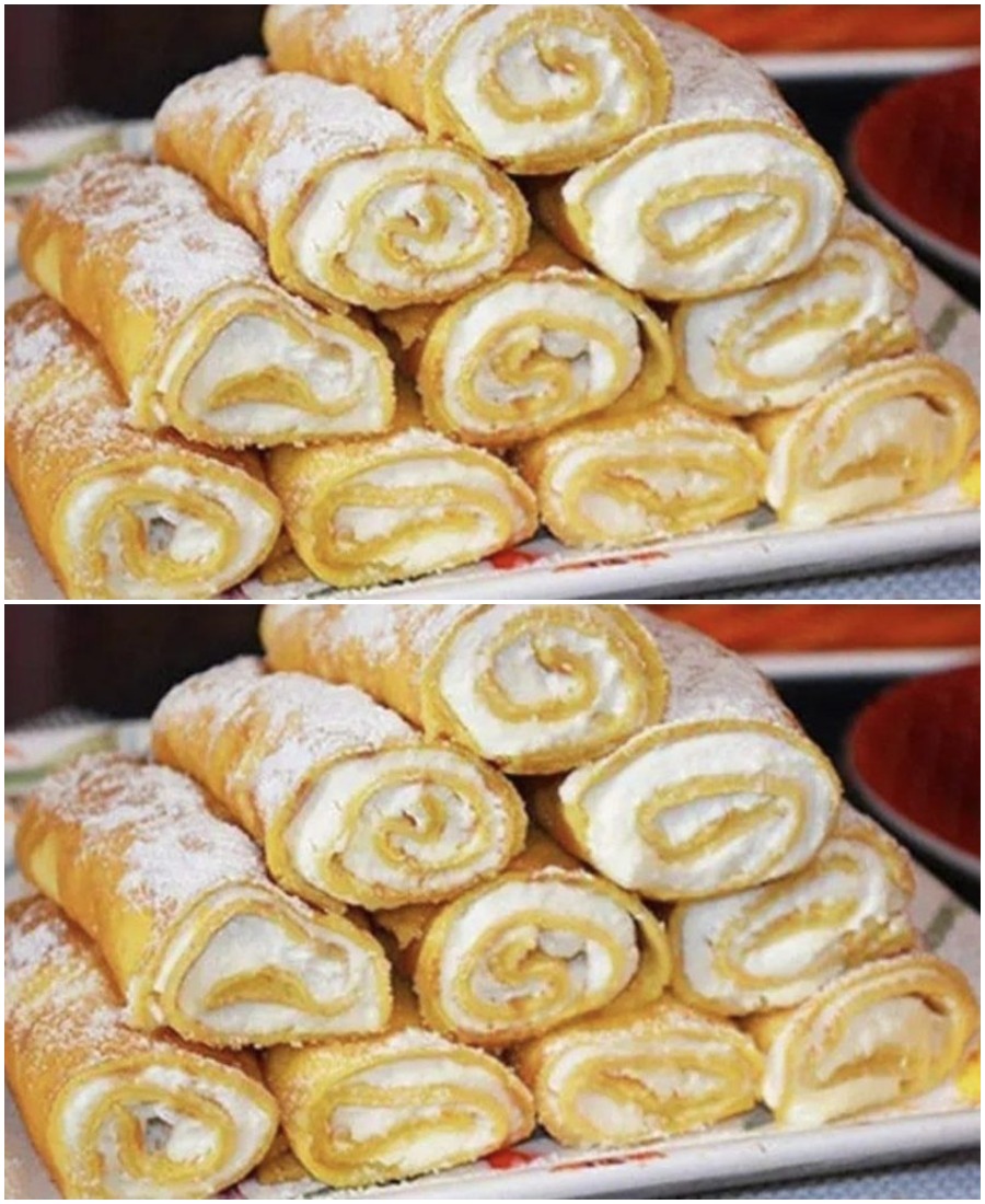 Для начинки: творог смешиваем с сахарной пудрой по вкусу (я добавляю две столовые ложки с горкой). Готовые блинчики смазываем творожной начинкой, сворачиваем в рулеты, разрезаем пополам и укладываем в форму для запекания.