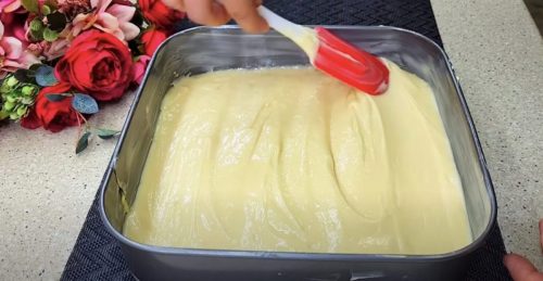 Подготовленную форму смажьте сливочным маслом и вылейте в нее тесто, равномерно распределяя по всей поверхности.