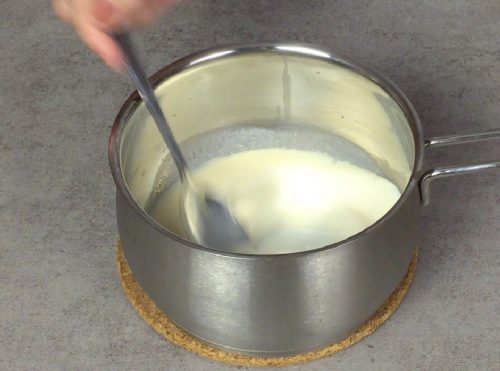 Отдельно, в сотейнике, засыпьте желатин, добавьте молоко и перемешайте. Нагрейте смесь на малом огне, чтобы желатин полностью растворился. Снимите с огня и влейте еще 50 мл молока, хорошо перемешайте.