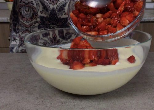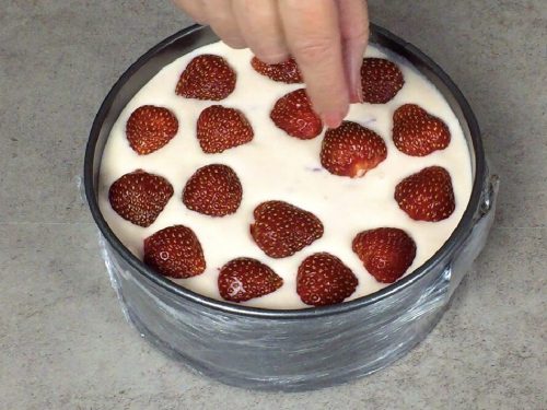Вмешайте в массу нарезанную клубнику.