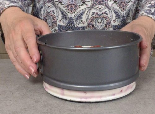 Возьмите разъемную форму диаметром 18 см, застелите ее пищевой пленкой, чтобы масса не вытекала. Переложите в нее подготовленную массу.