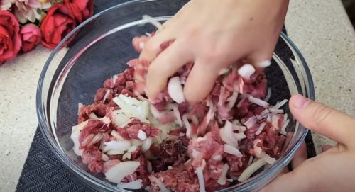 Шинкуем лук перьями тонкими, мясо – на маленькие кусочки. Соединяем лук с мясом, по вкусу перчим и солим, перемешиваем.