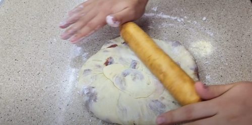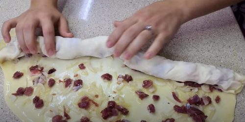Выкладываем начинку на тесто и сворачиваем его в рулеты.