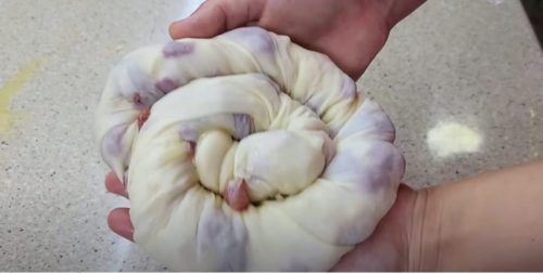 Готовим улитку дома. Тесто: В емкость с водой теплой и молоком добавляем соль, перемешиваем. Постепенно просеиваем в смесь муку и разрыхлитель, после замешиваем тесто. Колобки: Делим тесто на четыре равные части, колобки формируем. Убираем их в целлофан и на 10 минут оставляем.