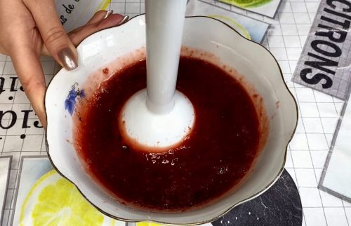 Начнем с того, что вам потребуется ваше любимое варенье, я выбрала вишневое, объемом 250 грамм. Чтобы избавиться от крупных кусочков фруктов, перебейте варенье погружным блендером до однородности.