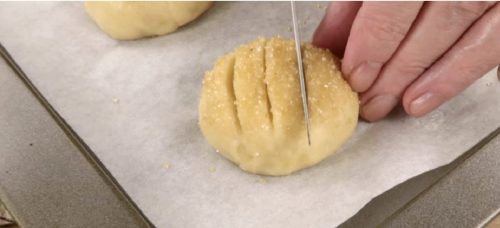 На противень, бумагой для выпечки застеленный, шарики раскладываю, застеленный бумагой для выпечки. Аккуратно делаю на каждом надрезы острым ножом.