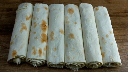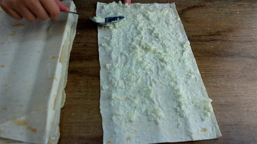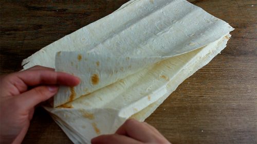 Возьмите тонкий лаваш, сложите его втрое и нарежьте на прямоугольные части. Вы должны получить 6 или 8 широких полос.
