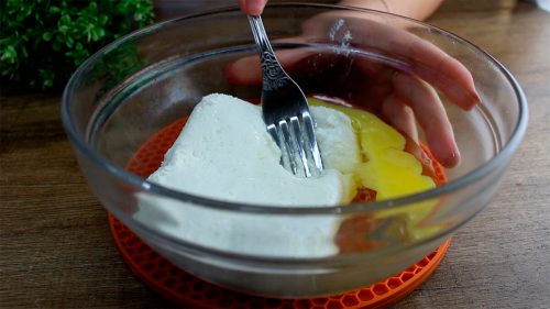 Теперь давайте сделаем начинку. В глубокой миске сочетайте 200 грамм творога с одним яйцом, тщательно разминая вилкой.