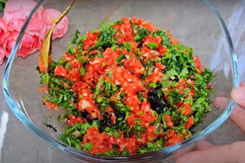 После мелко нарезаем базилик и кинзу, петрушку, укроп, и смешиваем зелень с массой из перцев.