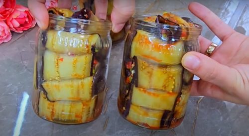 Заполняем получившимися рулетами стерилизованные банки объёмом 0,5 литра, утрамбовывая плотно.