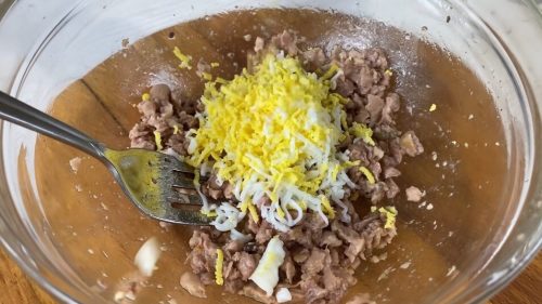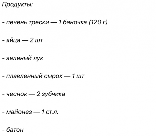Масло с печени трески сливаем, а саму печень разминаем вилкой до кусочков видимого размера. Рекомендую использовать цельный кусок печени в масле, так как он обладает лучшим вкусом и позволяет контролировать размер кусочков.