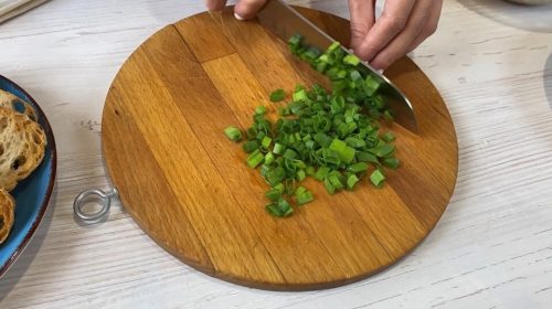Зеленый лук нарезаем средними или мелкими кусочками и добавляем к печени, яйцам и сыру.