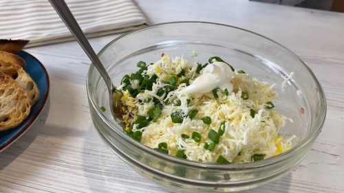 На тонкой терке трем вкрутую сваренные яйца и плавленый сырок.
