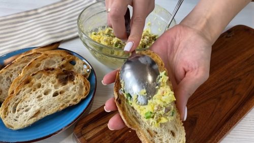 Осталось размазать намазку на хлеб. На один кусок хлеба обычно идет по одной столовой ложке намазки.
