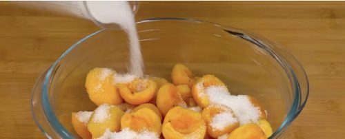 Выкладываю абрикосы в форму стеклянную и сахар добавляю. Обычно беру около 400 г сахара (если варенье сразу будем кушать, достаточно и 250 г).