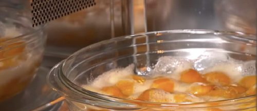 Ставлю форму на 7 минут в микроволновку на максимальной мощности (в моем случае это 800 Вт). После того, как микроволновка отключится, перемешиваю варенье и ставлю еще на 7 минут.