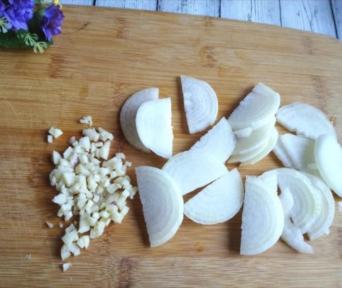 Лук полукольцами нарезаем, а чеснок — мелкими кусочками или через пресс (если хотите крупнее).