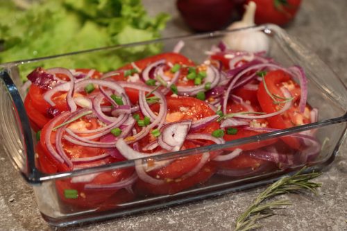Маринование: Поставьте закуску на 10-12 часов в холодильник. За это время томаты и лук хорошо пропитаются маринадом, а специи раскроются и придадут блюду неповторимый аромат.