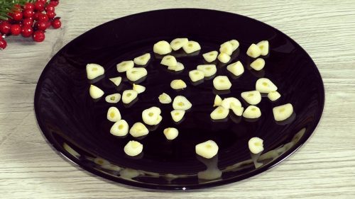 Итак, очищаем чеснок и нарезаем его тонкими полосками примерно одинакового размера.