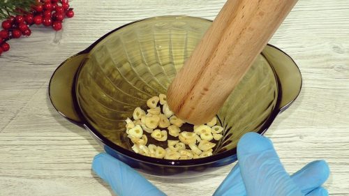 Затем сухой чеснок можно в кофемолке измельчить, но она потом долго сохраняет специфический запах, который удалить трудно. Поэтому я толкушку применяю.