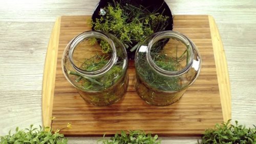 На дно стерилизованных банок кладу немного зелени — чаще всего это укроп.