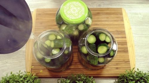 Затем заливаю огурцы готовым маринадом и закатываю банки.