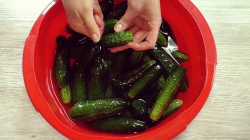 Затем тщательно промойте огурцы и удалите с них «хвостики», если вы не любите их оставлять.