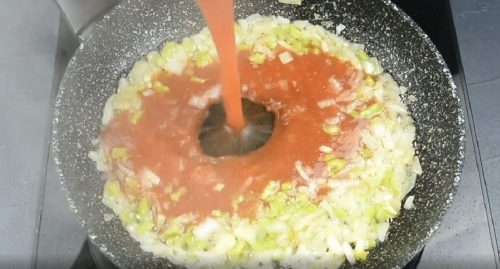 Когда лук подрумянится, добавьте томатную пасту или сок.