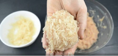 Промойте рис и слейте воду. Обваляйте каждый шарик в рисе со всех сторон.