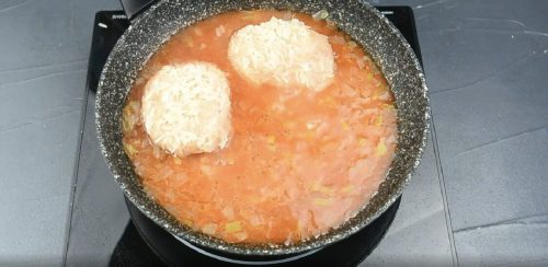 Выложите ежики в сковороду с соусом и тушите 30 минут на медленном огне. При необходимости добавьте немного воды, если соус сгущается.