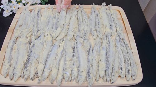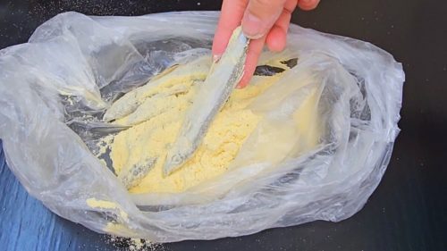 Таким образом, я обваливаю мойву в кукурузной муке.
