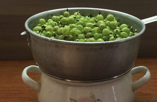 Промойте крыжовник в холодной воде, затем откиньте его на дуршлаг, чтобы стекла лишняя жидкость.