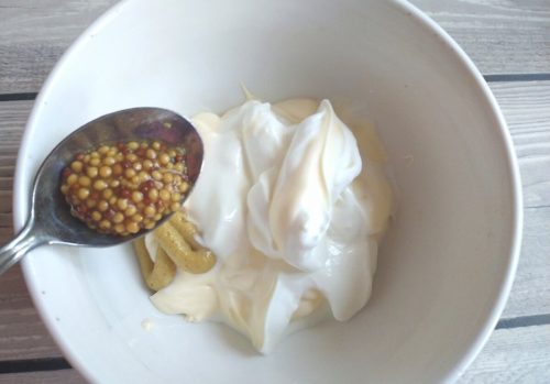 Для заправки майонез смешайте, сметану, уксус и горчицу, добавьте соль и перец по вкусу.