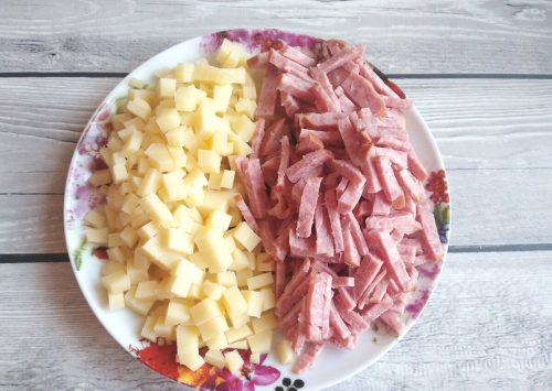 Колбасу от оболочки освободите и полосками тонкими ее нарежьте.
