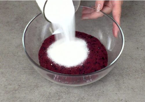Затем добавляю сахар — примерно 300 грамм на килограмм ягод, в зависимости от их сладости.