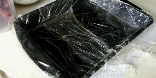 Я использую форму размером 20 на 25 см, которую выстилаю пленкой пищевой и смазываю маслом растит-м.