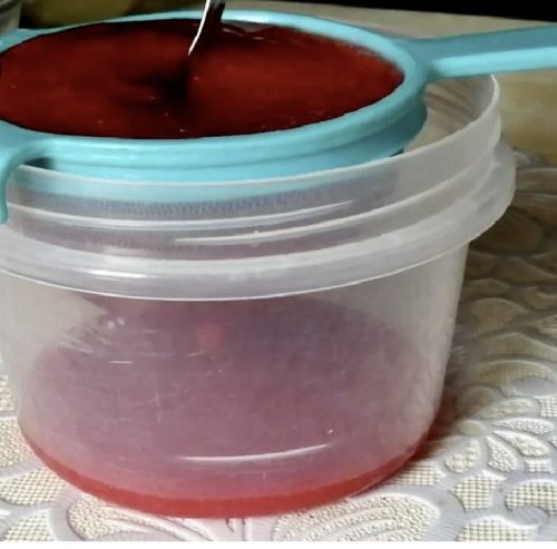 Чтобы избавиться от семечек, перетираем через сито массу клубничную.