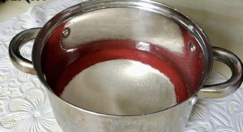 Выливаем в кастрюльку полученное пюре клубничное, сахар добавляем и на плиту ставим.