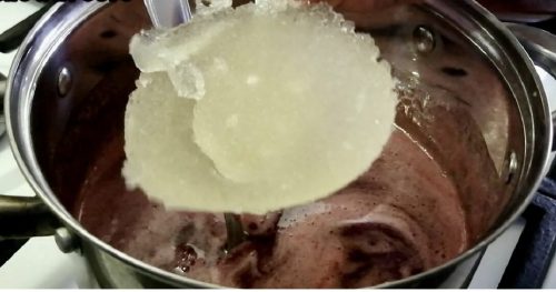 Сироп доводим до кипения, дабы полностью сахар растворился. Затем кастрюлю снимаем с огня и желатин набухший добавляем, чтобы он в сиропе горячем растворился.