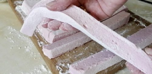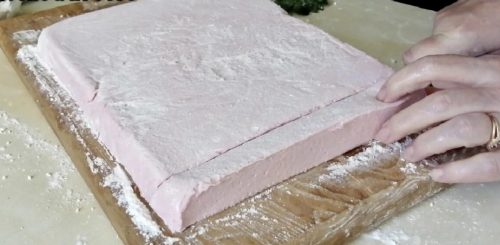 Когда зефир застынет хорошо, выкладываем на доску его, присыпанную смесью пудры сахарной и крахмала.