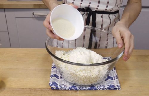 Возьмите большую миску и смешайте в ней следующие ингредиенты: творог, сметану, манную крупу, щепотку соли и ванильный сахар.