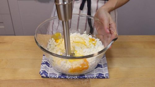 Хорошенько измельчите творожную массу с помощью погружного блендера до однородности.