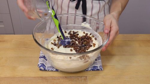 Изюм предварительно следует промыть, немного обсыпать мукой и аккуратно вмешать в творожную массу.