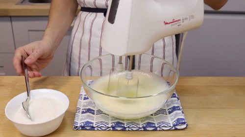В это время можно заняться белками: взбейте их до крепких пиков, постепенно добавляя сахар.