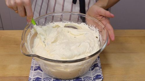 Аккуратно, небольшими порциями, введите взбитые белки в творожную массу.