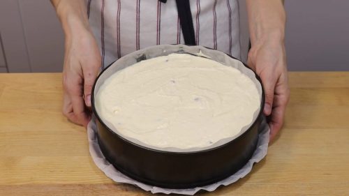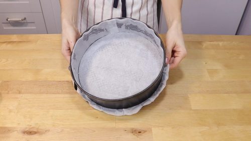 Подготовьте форму для выпекания диаметром 24 см, застелите дно пергаментом, а стенки формы смажьте маслом и также обложите пергаментом.
