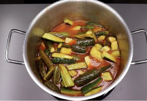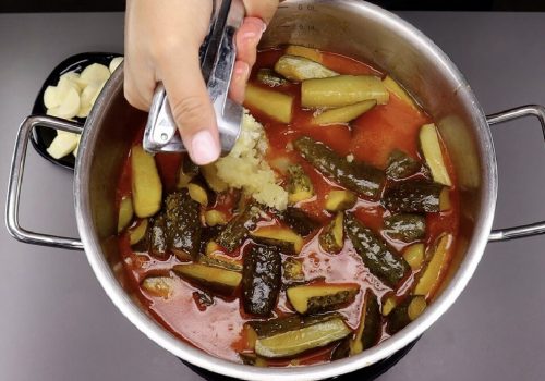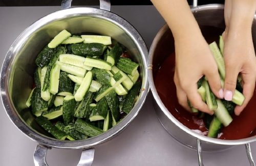 Распределяю маринад по кастрюлям и добавляю туда огурцы. Если огурцы выглядят вялыми, замачиваю их в холодной воде на несколько часов — они восстановят свою свежесть.