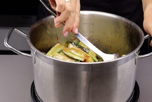 Перемешиваю огурцы с чесноком, варю еще 10 минут.