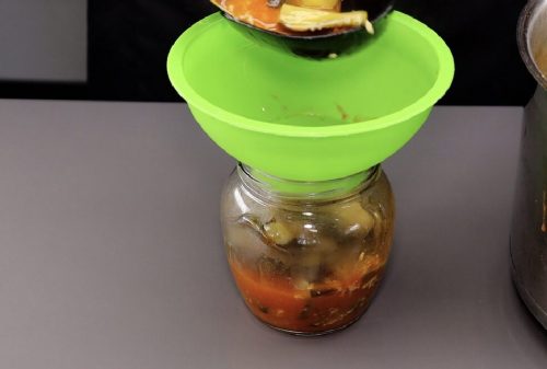 Для начала я беру обычные крышки на банки, которые не требуют стерилизации. Просто ополаскиваю их кипятком, встряхиваю и выливаю воду.