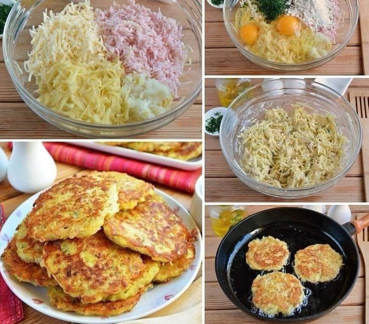 Приготовление: 1. Почистить картофель, лук, порежьте мелко укроп. 2. Натрите на крупной терке: картофель, сыр, ветчину, лук. Добавьте по вкусу соль и черный перец молотый.